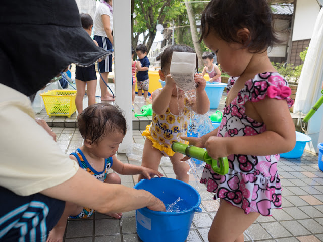 | かきほいくのおやくそくは、はれたらみずあそび。 ぜったいみずあそび。なにがなんでもみずあそび。 |